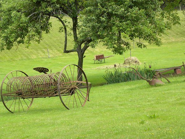 Dans notre pré, nous avons mis comme décor des engins anciens, dont certains étaient déjà la avant notre arrivée et d'autres que nous avons chinés.